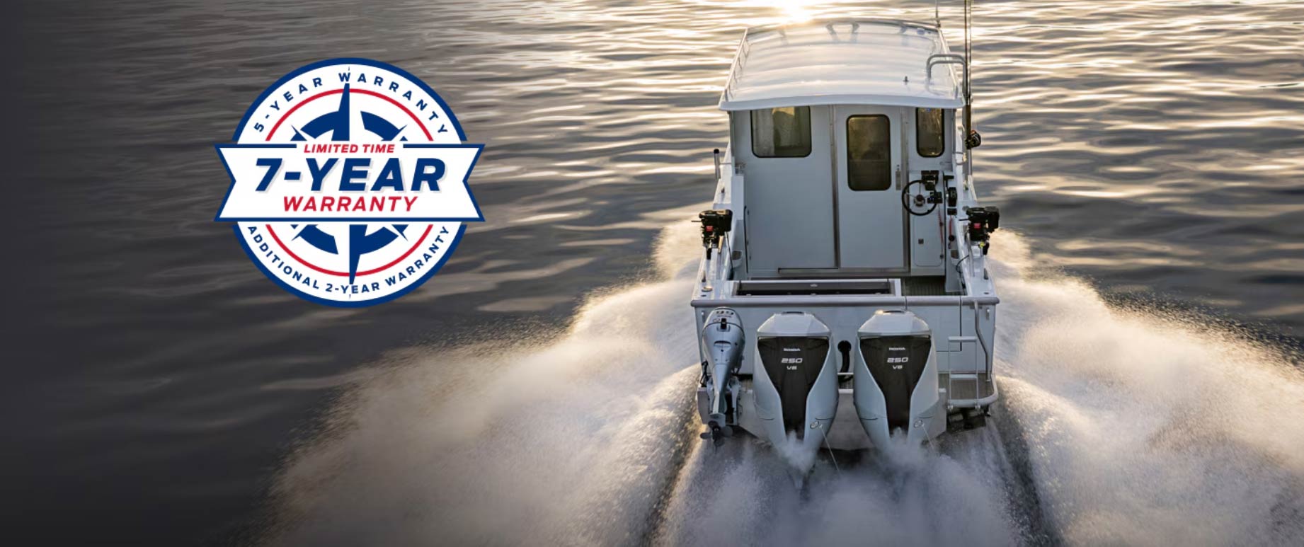 LEGAL: *† Two-year no charge Honda Plus Extended Warranty offer is available on the purchase of a new and previously unregistered Honda outboard from a participating Honda Marine dealer in Canada between January 1, 2026 and March 31, 2026. Offer cannot be applied to past transactions and has no cash surrender or other value. "7 years of coverage" is based on: (i) a 60-month (5-year) distributor's warranty; and (ii) the 2-year no charge Honda Plus Extended Warranty. Honda Plus Warranty is subject to all terms and conditions available at http://marine.honda.ca/en/warranty Conditions apply. See your Honda dealer for full details.
